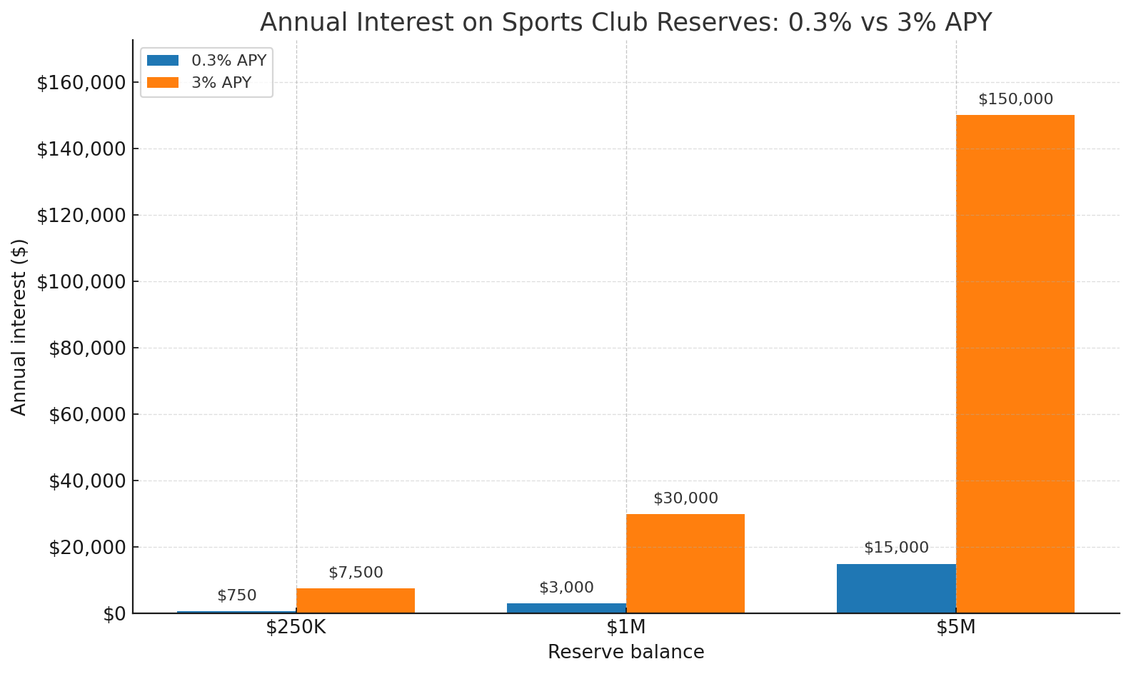 For sports organizations, every dollar saved or earned goes back into the mission. Whether it’s new equipment, fee scholarships for athletes, or facility upgrades. Yet too many clubs unknowingly bench their reserves in accounts yielding 0.1%–0.4% interest. Consider a mid-size hockey club that maintains a $1 million reserve for contingencies and off-season expenses. If that $1M sits in a typical bank at 0.3% APY, it earns only about $3,000 a year. In a 3% APY high-yield account, it would earn $30,000 – an extra $27,000 per year in free money. That $27K could cover about 45 player scholarships or tournament travel for multiple teams without a single new fundraiser. This is the “competitive funding gap” facing sports clubs: idle cash in low-yield accounts is a huge missed opportunity.